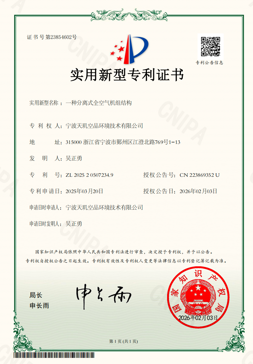 宁波天玑空品自主研发的“分离式全空气机组结构”正式获得国家实用新型专利授权(专利号:ZL202520507234.9)。该技术已在意大利品牌埃珂贝夫全空气上率先采用,并且投入市场运营四年,凭借其显著适应中国住宅层高受限、机房空间紧张的安装环境,在多个实际项目中成功应用,客户使用反响热烈。